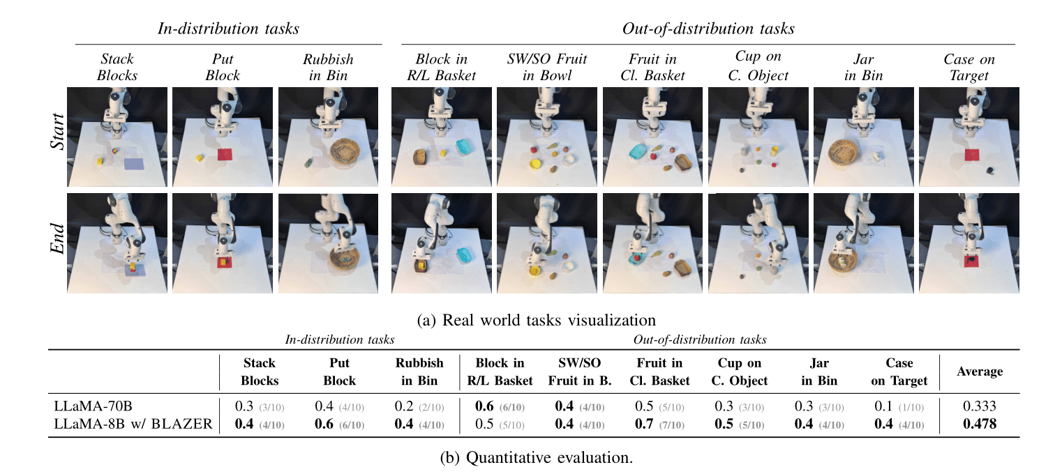 Real world results. We compare LLaMA-8B with \( \text{BLAZER} \) against LLaMA-70B on real-world tasks depicted. From quantitative results in the Table, we outperform the baseline, both on In-distribution tasks (similar to \( \mathcal{T} \)) and Out-of-distribution tasks, showcasing the generalization capability of \(\text{BLAZER}\).