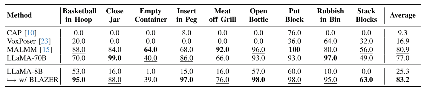 Comparison with zero-shot baselines. We report the task success rate (%) for different methods applied to the nine manipulation tasks from RLBench. With a small LLaMA-8B model fine-tuned with BLAZER, we are able to achieve the best performance. Note how LLaMA-8B with \( \text{BLAZER} \) considerably outperforms LLaMA-70B, which was used as \( \text{LLM}_\text{boot} \). This implies that \( \text{BLAZER} \) can yield LLMs that outperform their teacher models on manipulation tasks. The table highlights the best-performing method for each task in bold and the second-best method as underlined.
